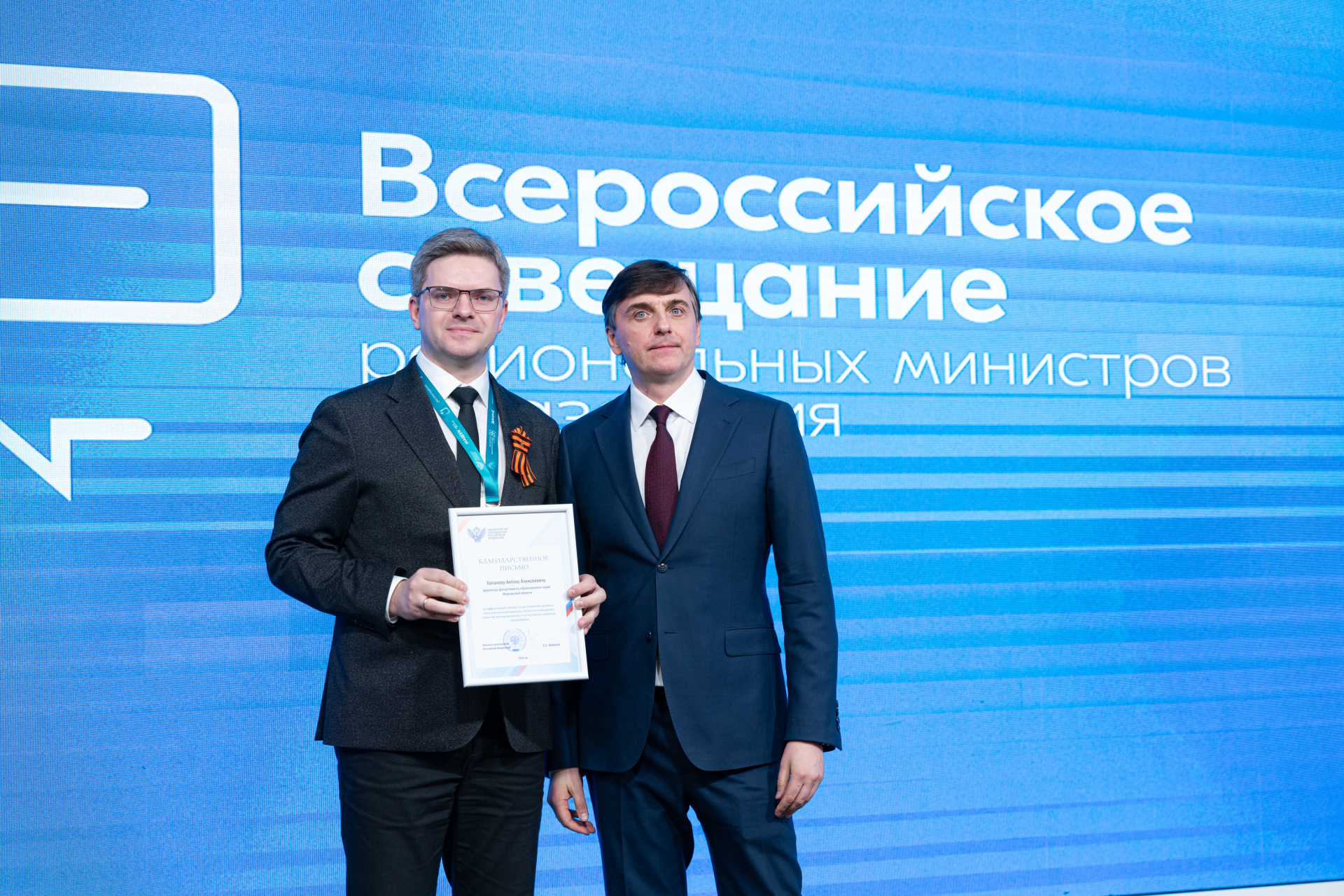 Благодарственное письмо Министр вручил члену правительства Ивановской области - руководителю регионального департамента образования и науки Антону Хапалову.