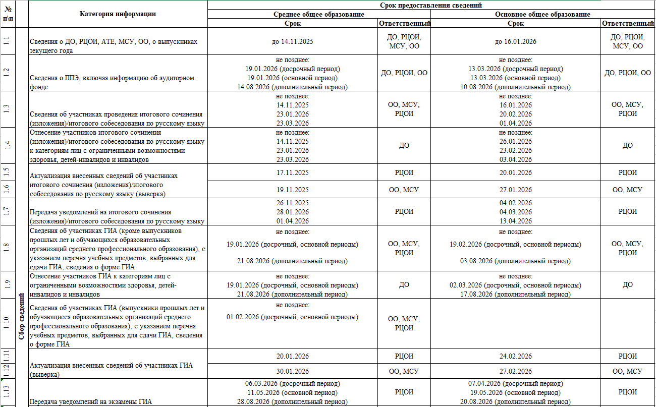 | График предоставления сведений и их внесения в региональную информационную систему обеспечения проведения государственной итоговой аттестации обучающихся, освоивших основные образовательные программы основного общего и среднего общего образования на 2025/2026 учебный год |