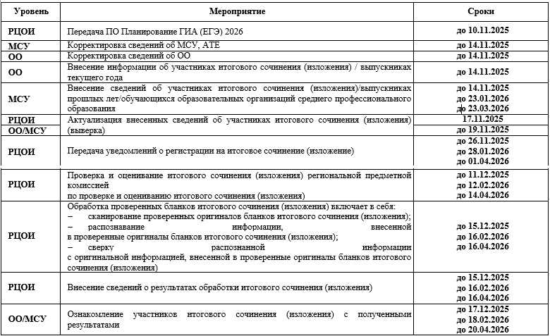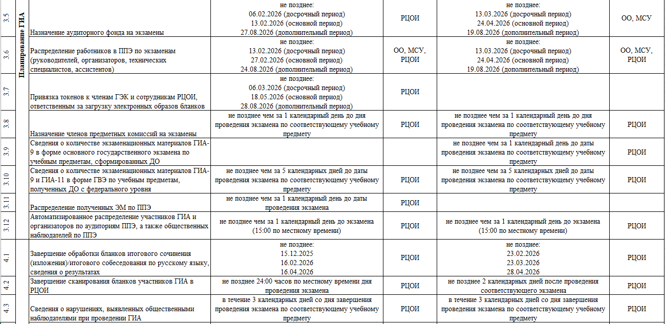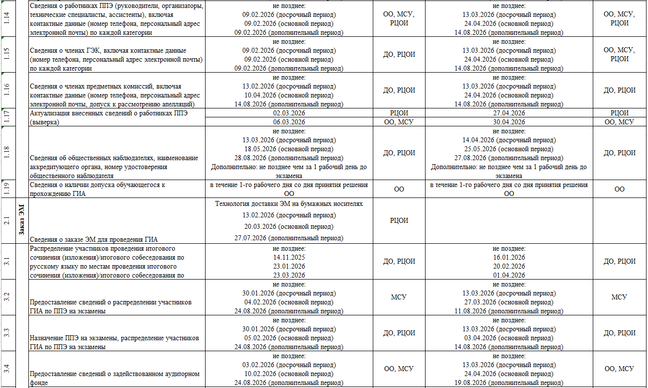 Допуск к ГИА-9: 1) основной срок (вторая среда февраля) - 11 февраля 2026 года 2) дополнительный срок 1 (вторая рабочая среда марта) - 11 марта 2026 года 3) дополнительный срок 2 (третий понедельник апреля) - 20 апреля 2026 года Допуск к ГИА-11: 1) основной срок (первая среда декабря) - 3 декабря 2025 года 2) дополнительный срок 1 (первая среда февраля) - 4 февраля 2026 года 3) дополнительный срок 2 ((вторая рабочая среда апреля) - 8 апреля 2026 года Досрочный период: с 20.03.2026 (ГИА-11); с 21.04.2026 (ГИА-9) Основной период:с 01.06.2026 (ГИА-11); с 02.06.2026 (ГИА-9) Дополнительный период:с 04.09.2026 (ГИА-11); с 03.09.2026 (ГИА-9) |